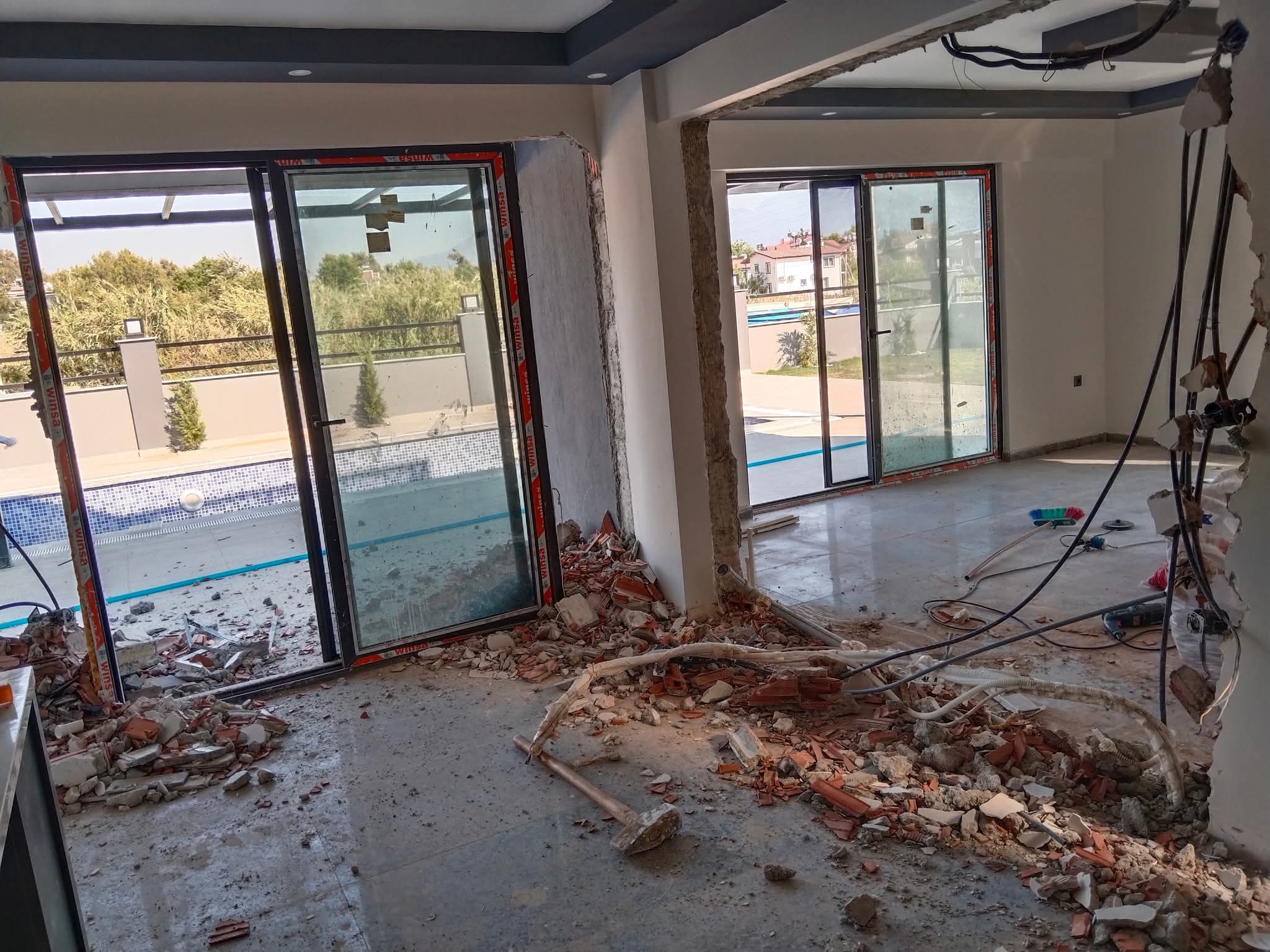 Duvar kırımı: Salon–mutfak arasındaki duvar güvenli biçimde kaldırıldı; molozlar uzaklaştırıldı.